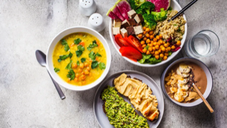 tomatensoep, verschillende salades, burgers, (wok)groente,